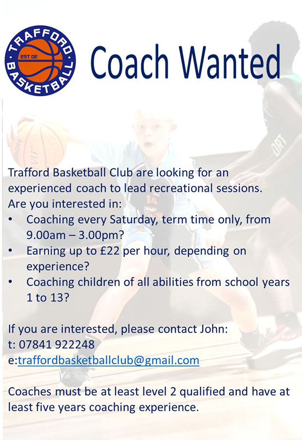 Trafford Basketball Club are looking for an experienced coach to lead recreational sessions. Please contact John on 07841 922248 or email traffordbasketballclub@gmail.com to apply.